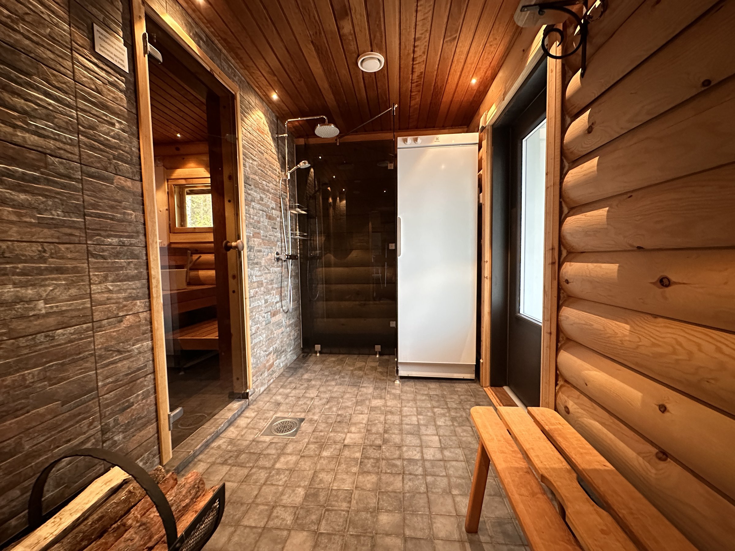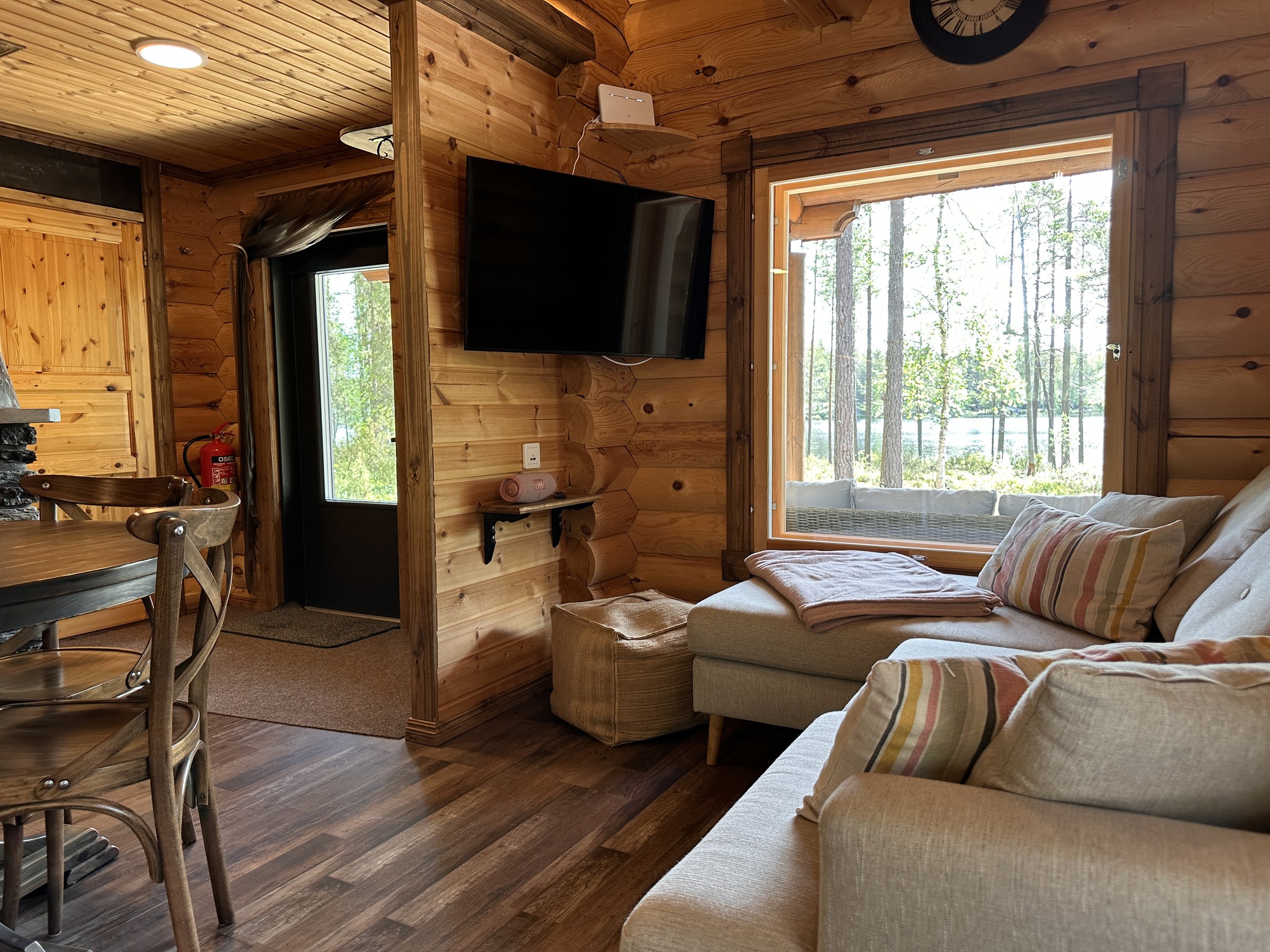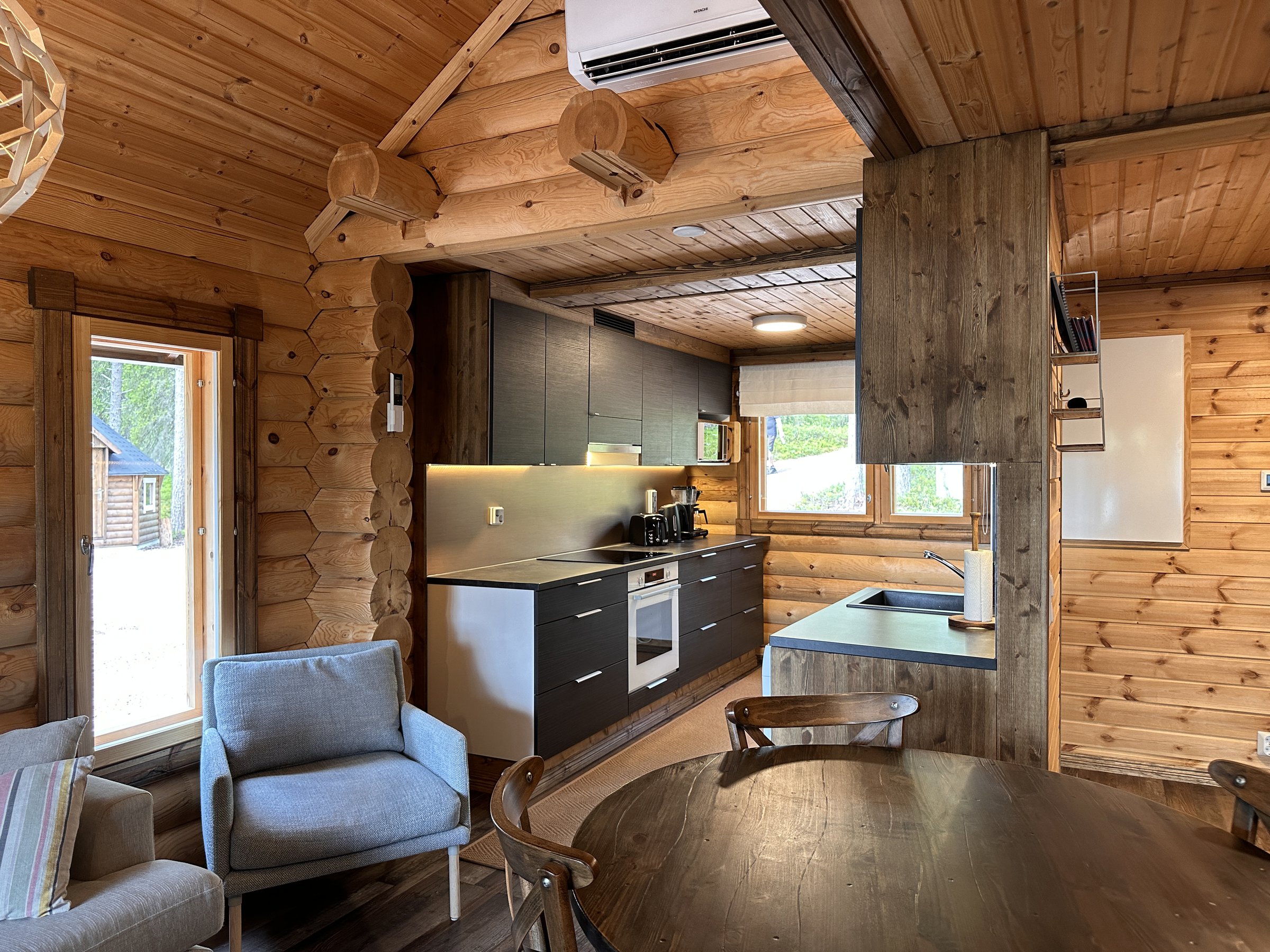 Hiekkaranta boasts a well-equipped and ample kitchen, perfect for preparing delightful meals. The inviting living room features a soapstone fireplace, Smart TV, and panoramic views of the Kitka River, making it an ideal spot for gathering after a day of exploration. The outdoor area includes a newly built spacious grill hut, perfect for culinary enthusiasts, along with a smoker and a Muurikka pan for diverse cooking experiences. With air conditioning and a heat pump, the cabin stays pleasantly cool during the summer months, ensuring a restful slumber in its comfortable beds.