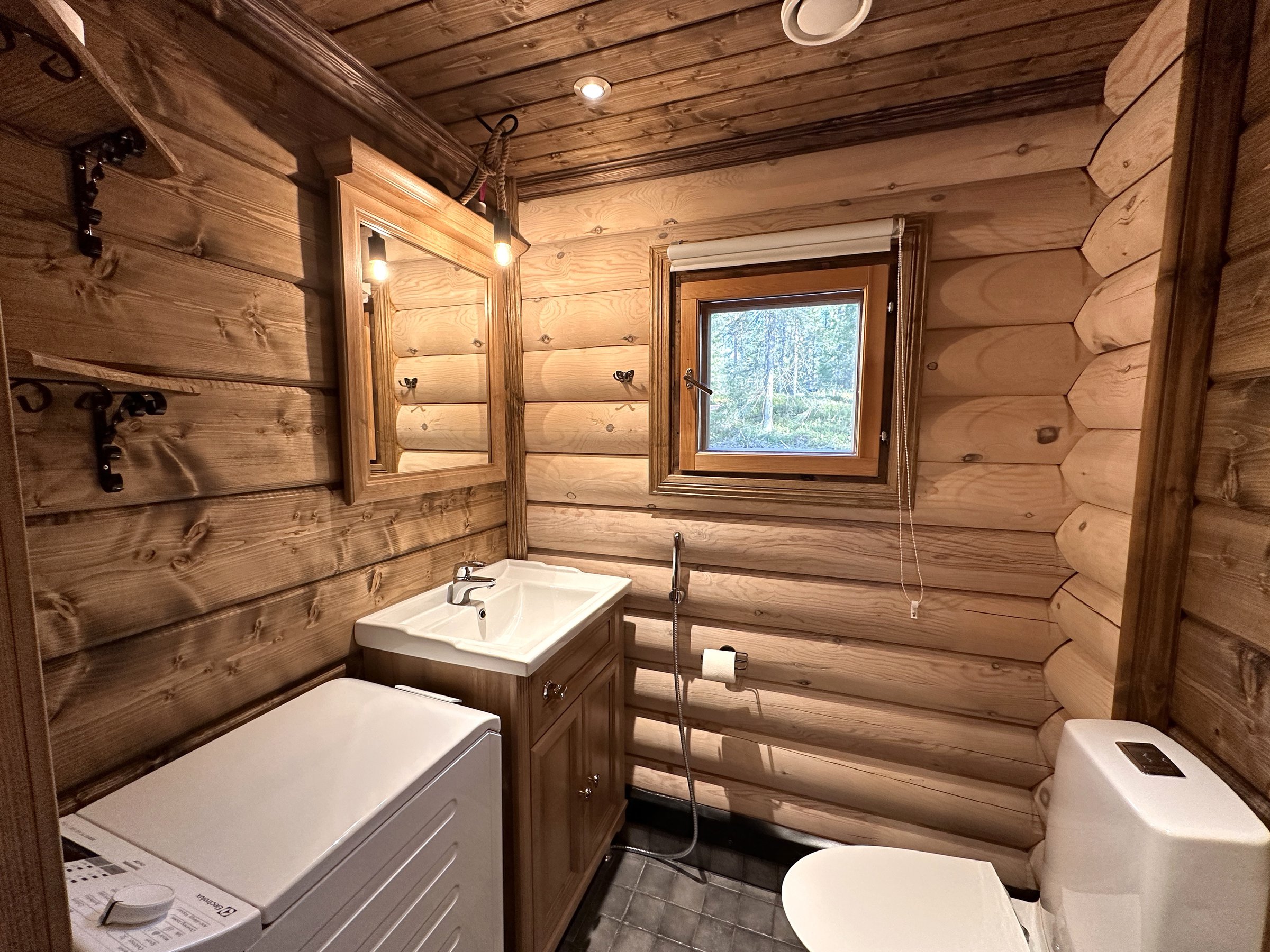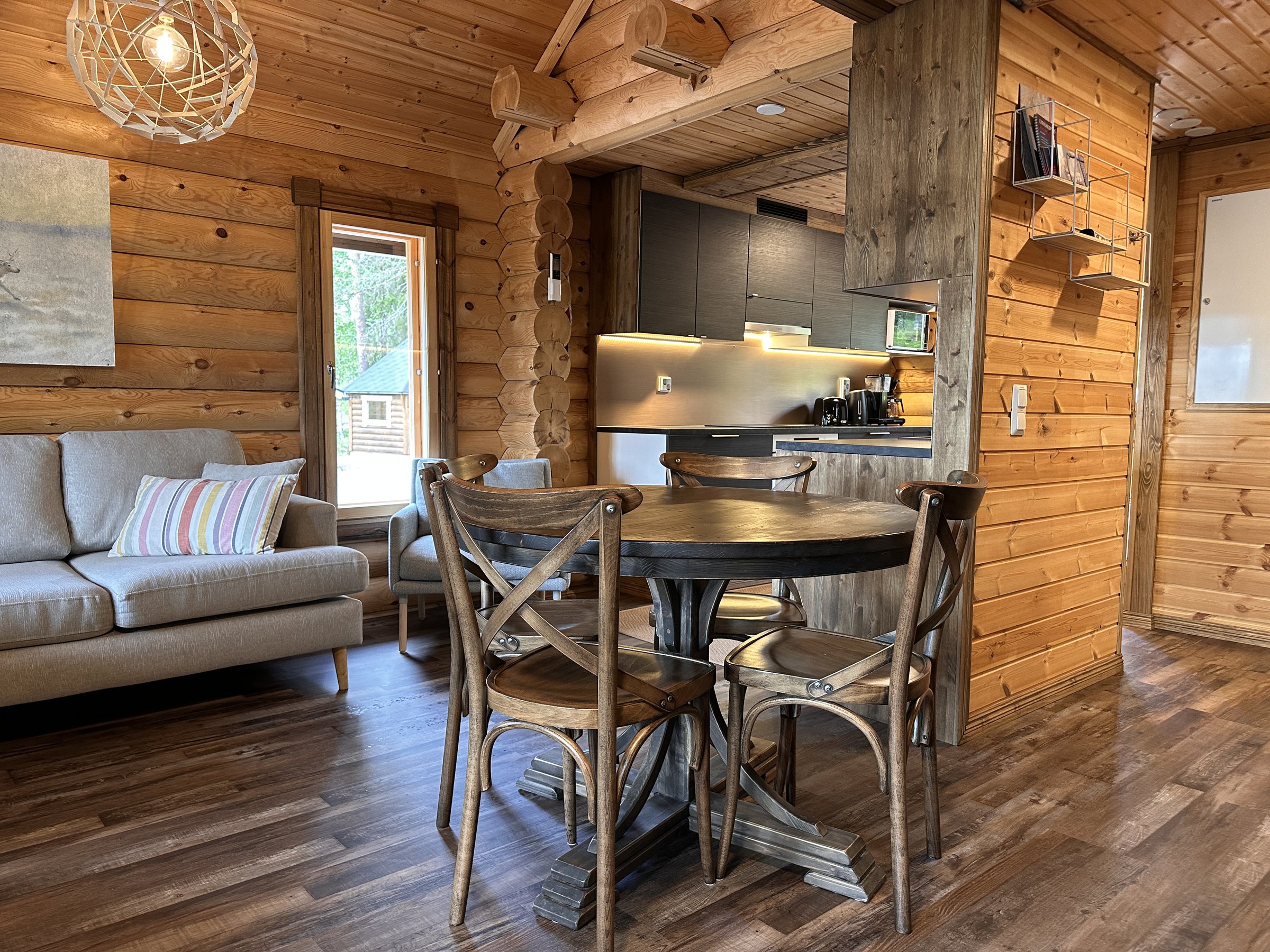 In winter, the Kitka River wilderness trail—located conveniently across the river—connects to the well-lit Käylä ski trails, and snowmobile paths are easily accessible. The cabin is outfitted with two pairs of snowshoes and telescopic poles, perfect for winter explorations. An electric car charging station, Webasto Pure II, is available for an additional fee to enhance your stay.