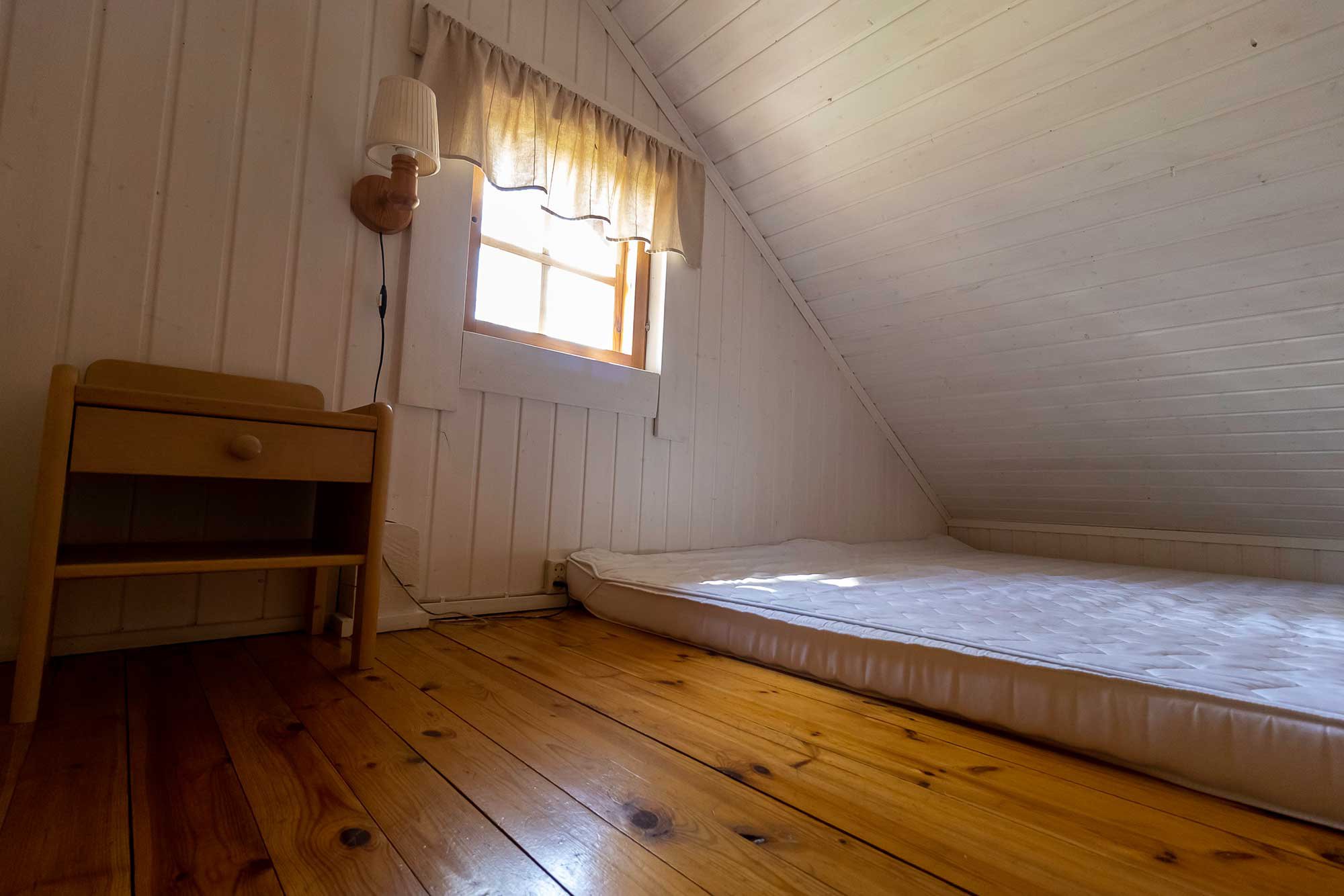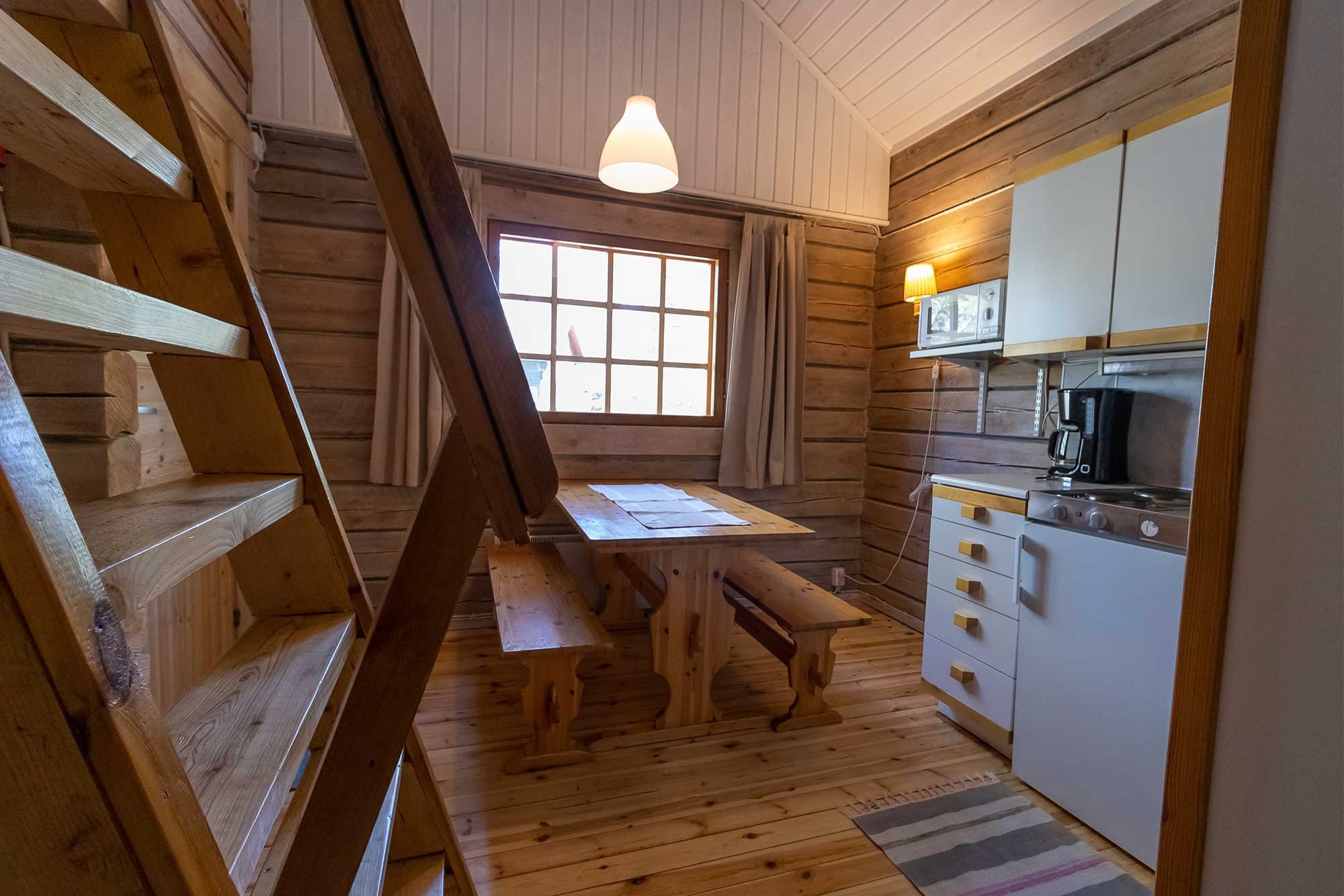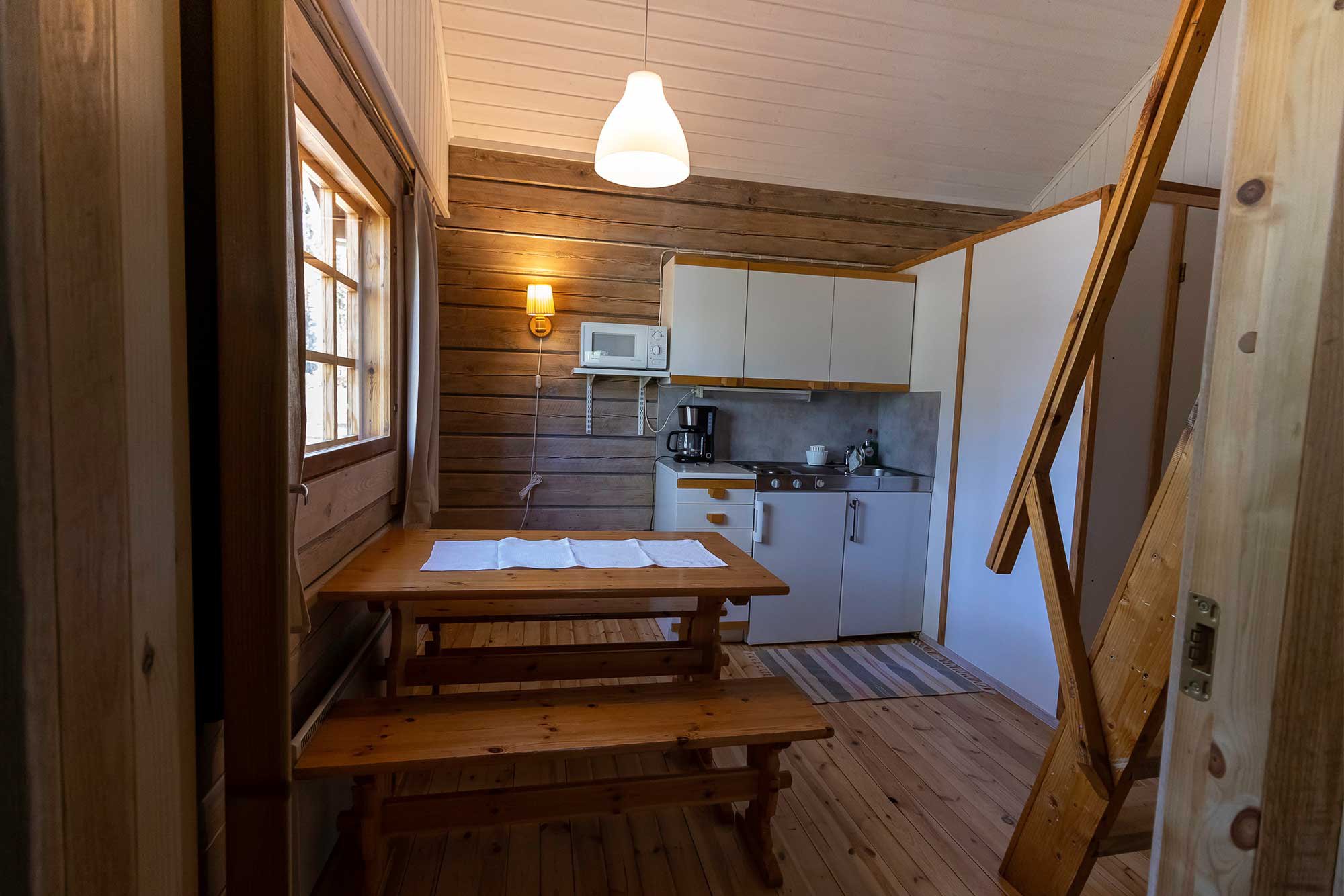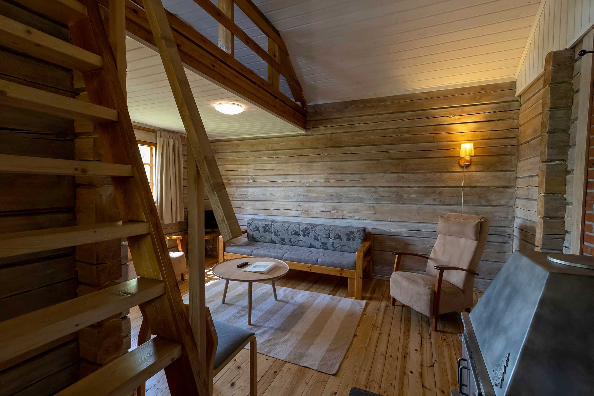 Mökki 3 is designed to accommodate up to six guests, making it an ideal retreat for families or small groups. The sunny yard promises delightful evenings, especially as the setting sun bathes the space in a warm glow. Inside, you are greeted by bright rooms that retain their traditional spirit, featuring comfortable armchairs and a charming old fireplace that beckons for cozy nights in. The well-designed sleeping arrangements are primarily in the loft, with an additional sofa bed located on the main level for added convenience. One of the lofts is equipped with a safety gate, ensuring a worry-free environment for your little ones.