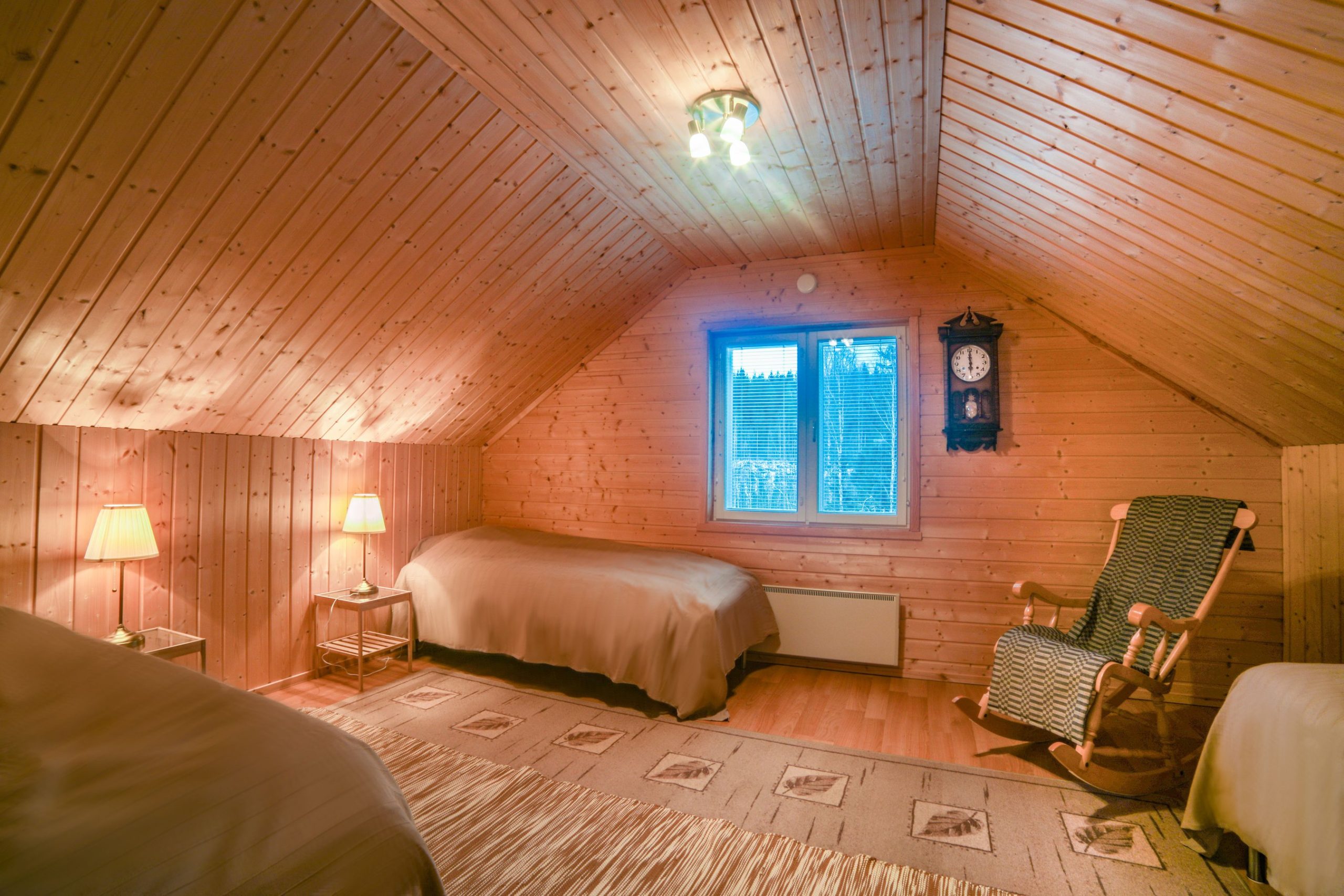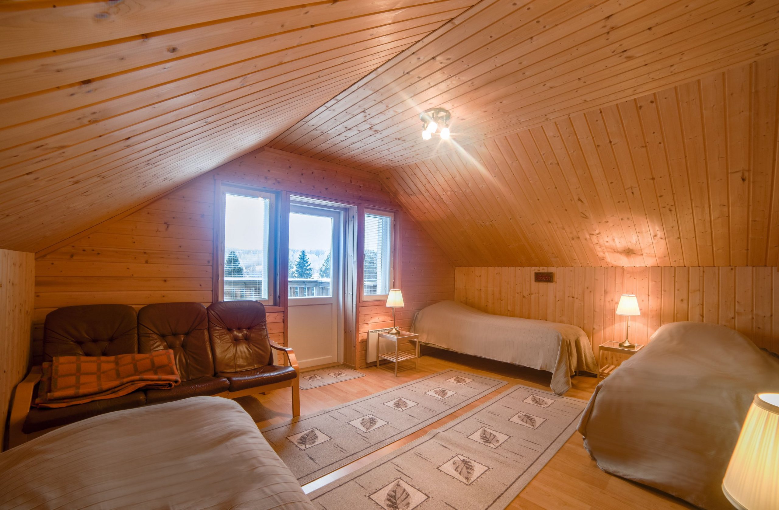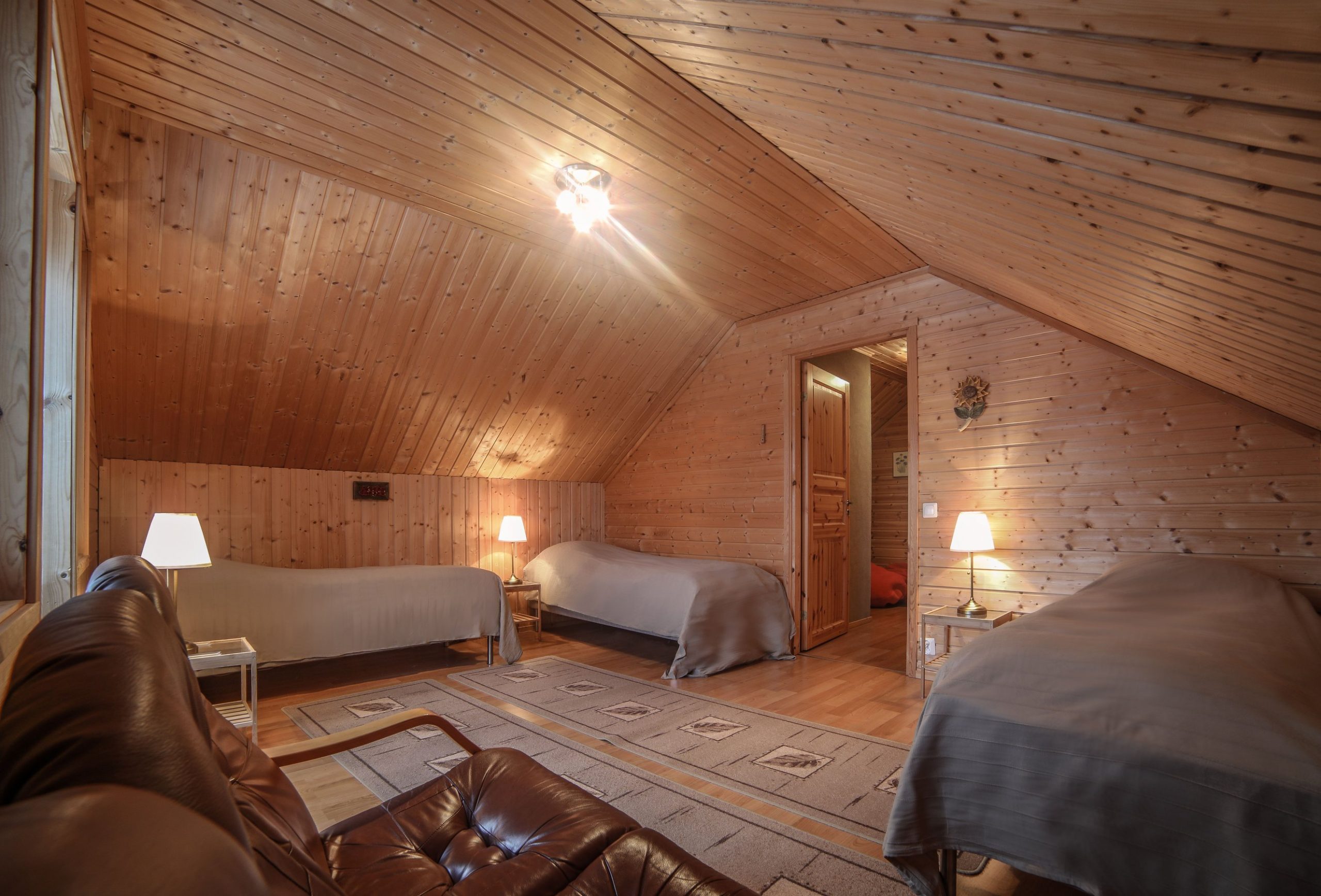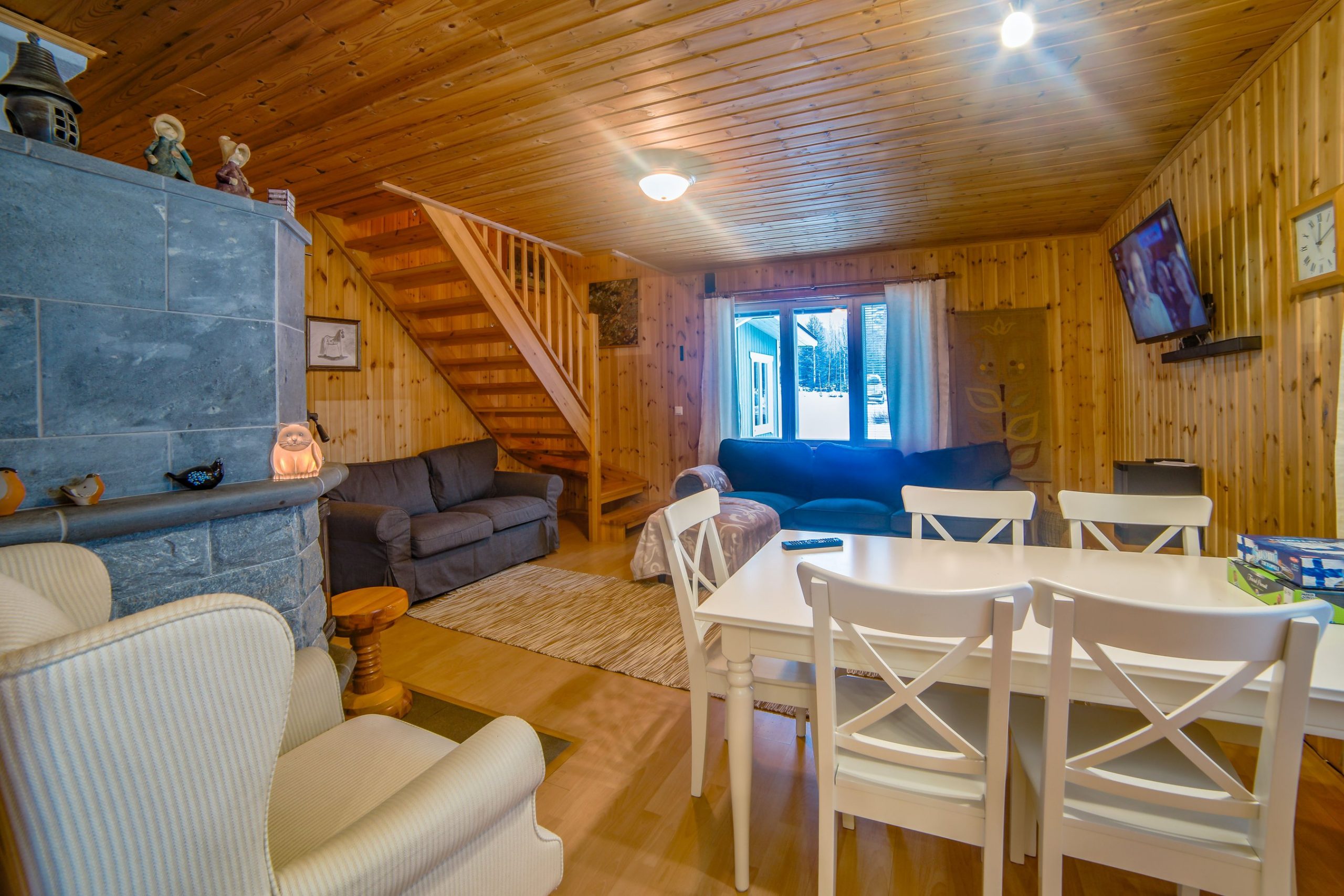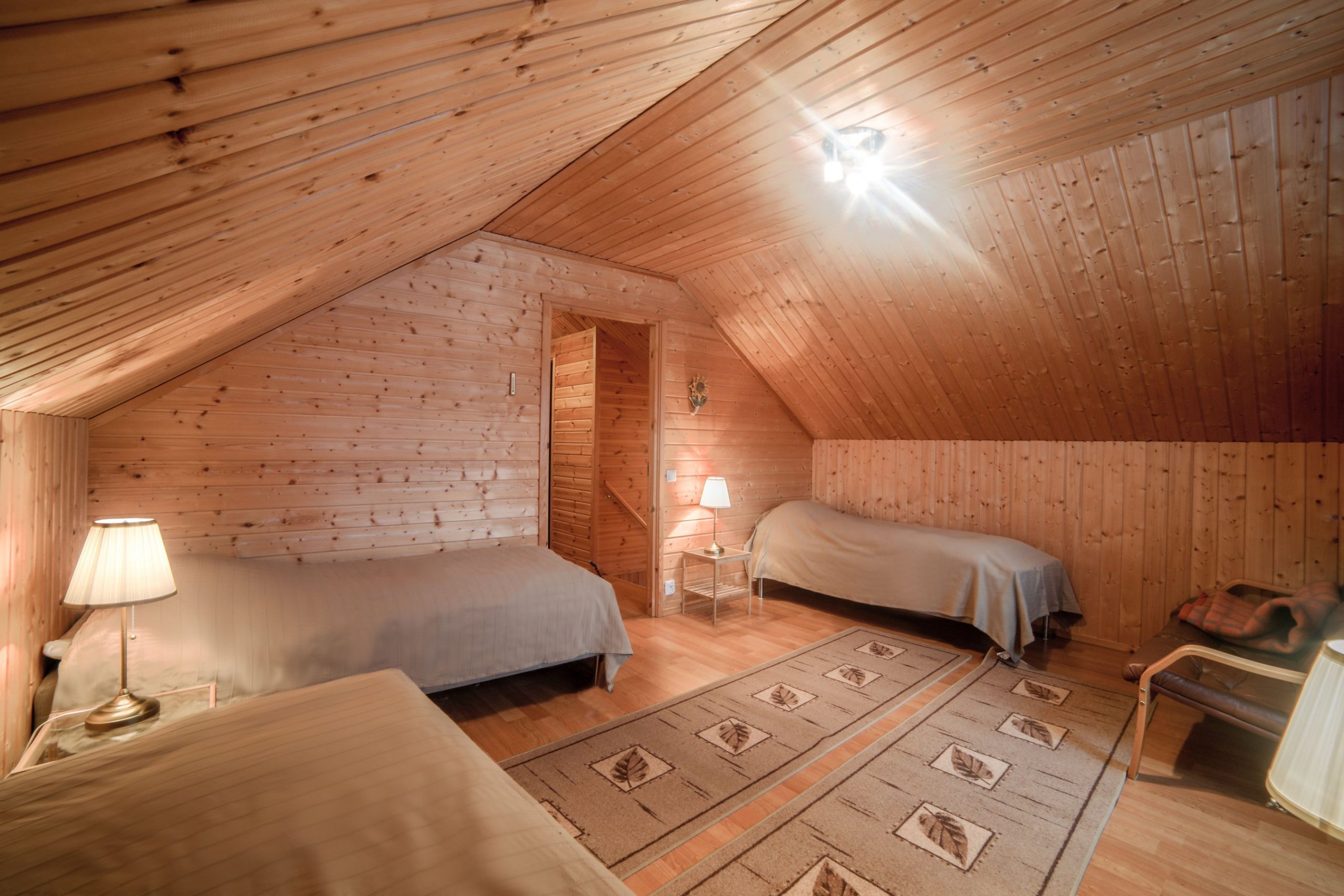Paukkila is replete with thoughtful amenities to enhance your stay. The interior welcomes you with a spacious kitchen and a comfortable living area on the ground floor, where you’ll find two inviting bedrooms, a clean bathroom featuring a washing machine, and a stylish electric sauna. Both downstairs bedrooms come equipped with walk-in closets offering ample storage for your vacation essentials. For entertainment, gather around the high-quality home theater system in the living area, allowing you to connect your devices and enjoy your favorite films or music.