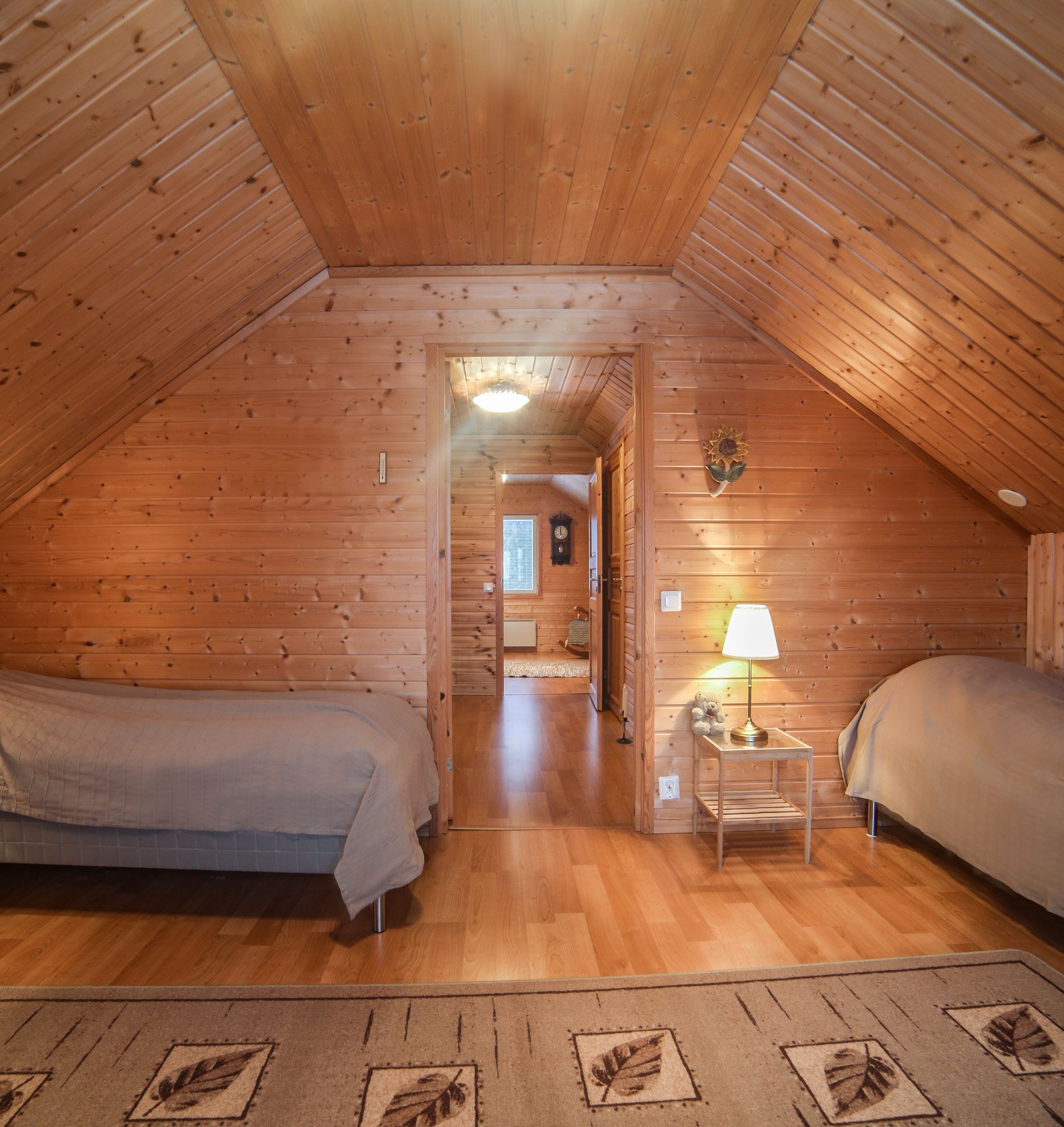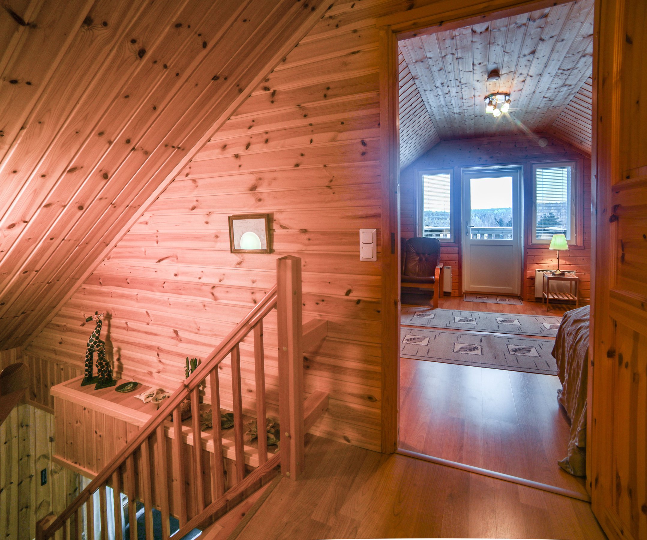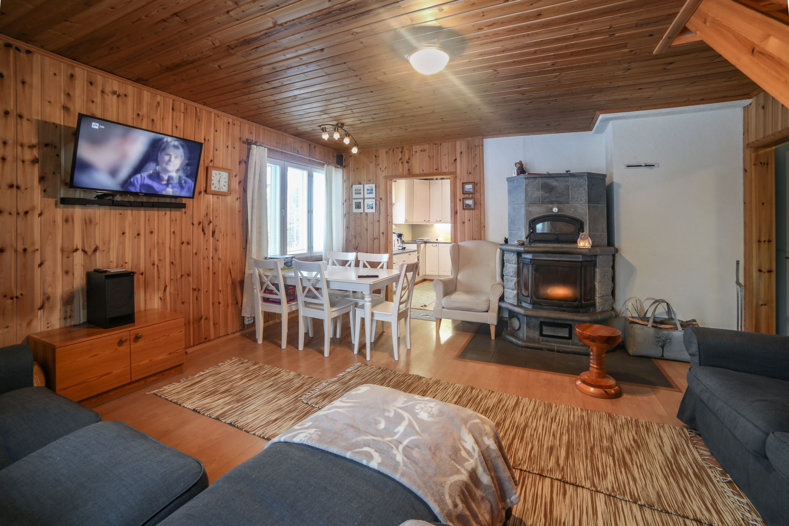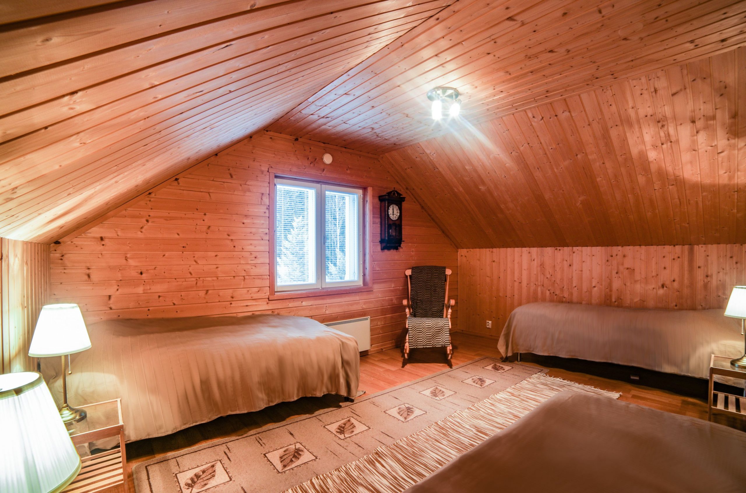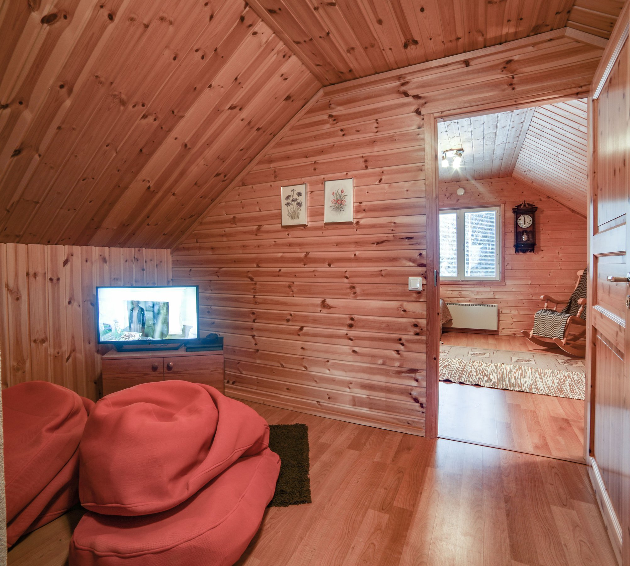 Paukkila is replete with thoughtful amenities to enhance your stay. The interior welcomes you with a spacious kitchen and a comfortable living area on the ground floor, where you’ll find two inviting bedrooms, a clean bathroom featuring a washing machine, and a stylish electric sauna. Both downstairs bedrooms come equipped with walk-in closets offering ample storage for your vacation essentials. For entertainment, gather around the high-quality home theater system in the living area, allowing you to connect your devices and enjoy your favorite films or music.