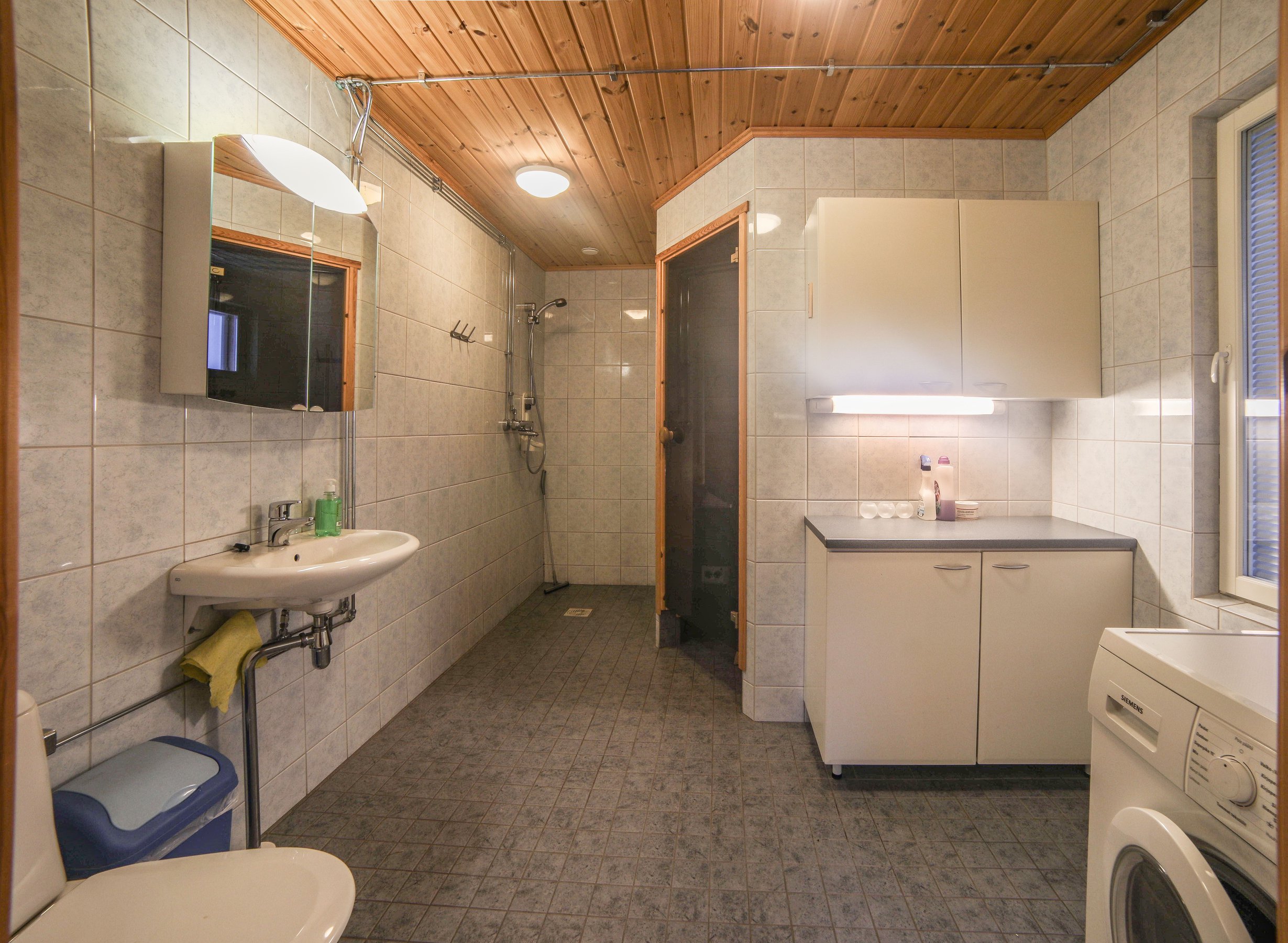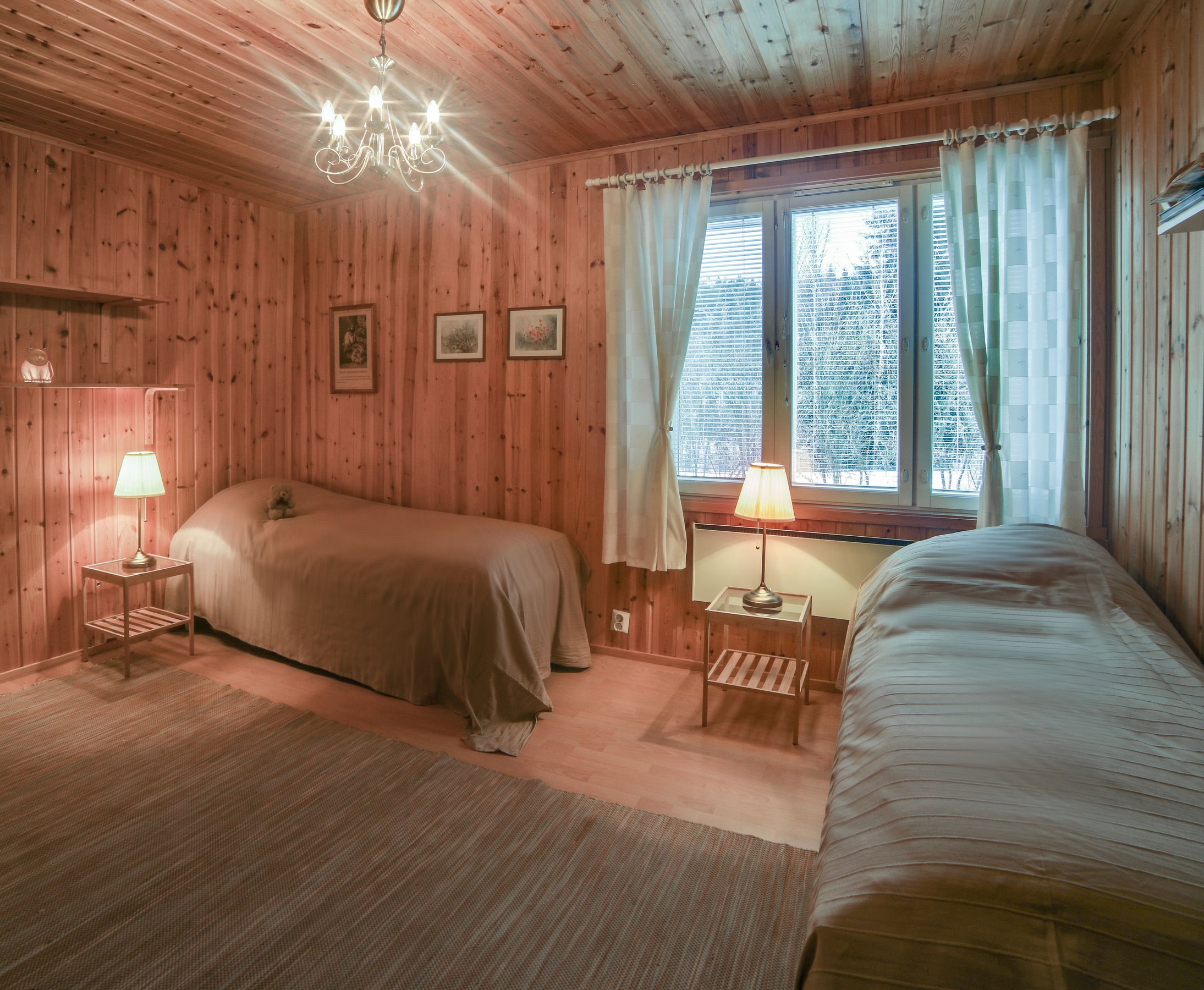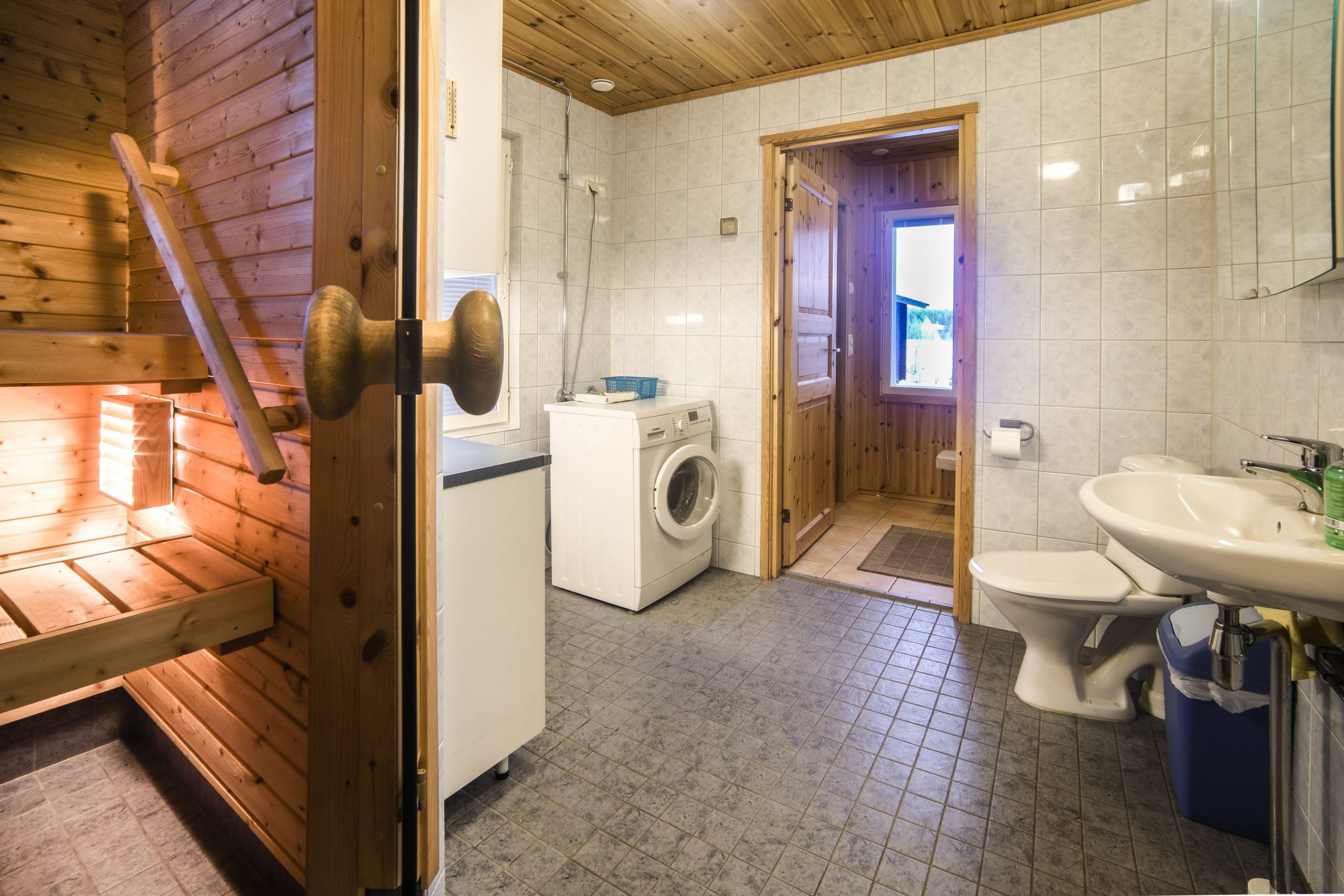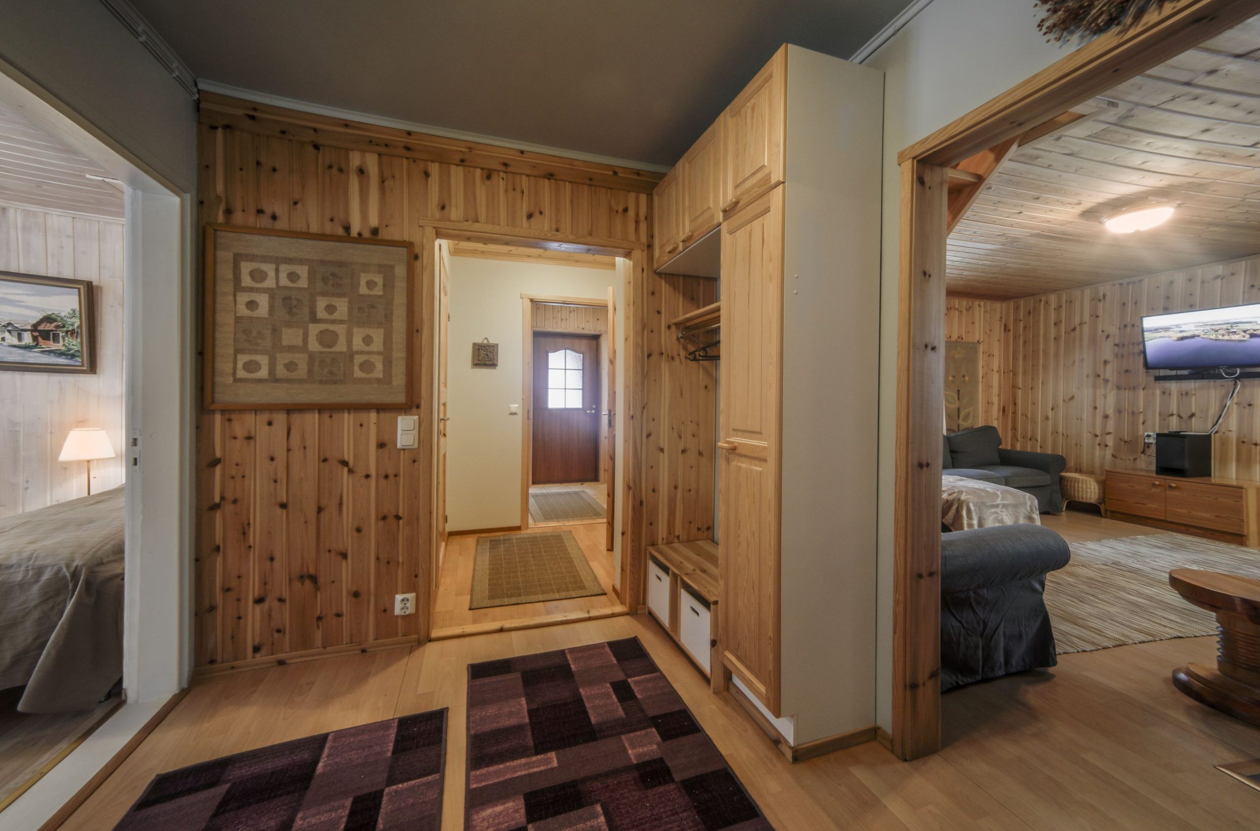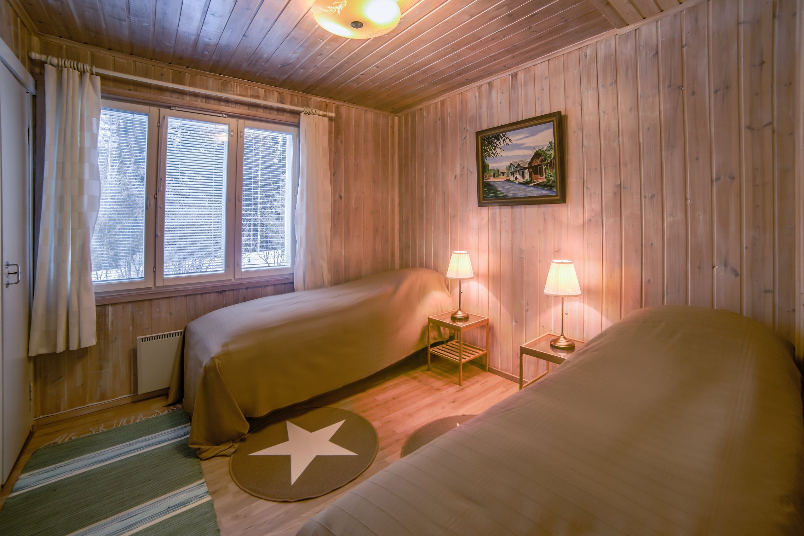 Paukkila is replete with thoughtful amenities to enhance your stay. The interior welcomes you with a spacious kitchen and a comfortable living area on the ground floor, where you’ll find two inviting bedrooms, a clean bathroom featuring a washing machine, and a stylish electric sauna. Both downstairs bedrooms come equipped with walk-in closets offering ample storage for your vacation essentials. For entertainment, gather around the high-quality home theater system in the living area, allowing you to connect your devices and enjoy your favorite films or music.