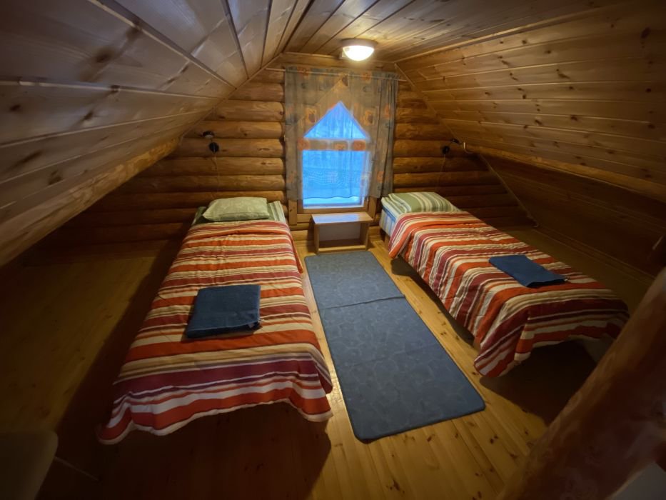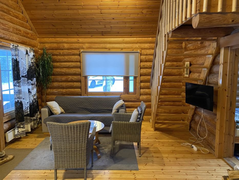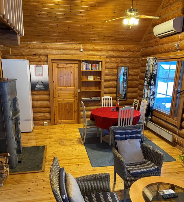 Sampola accommodates up to 6 guests, making it an ideal getaway for families, friends, or small groups. With its 70 m² of thoughtfully designed space, the cabin features a cozy bedroom and a snug loft, each providing comfortable sleeping arrangements for two. The inviting living area offers a sofa bed, perfect for accommodating additional guests. The cabin’s robust hand-hewn logs and the beautiful soapstone fireplace exude a warm and authentic cabin ambiance that will make you feel right at home.